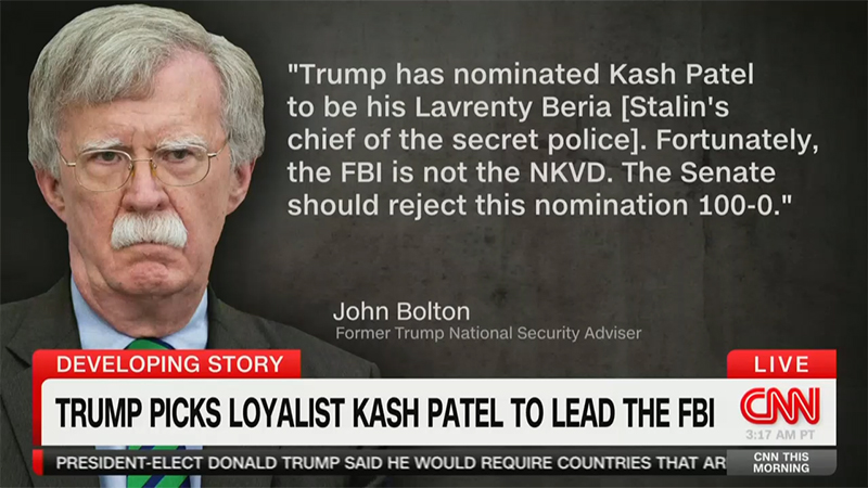 President-elect Donald Trump selecting Kash Patel as his head of the FBI has drawn major backlash, including on Sunday from former Trump National Security Adviser John Bolton, who compared the pick to an infamous head of the Soviet secret police under Joseph Stalin.