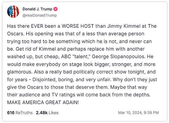 “Has there EVER been a WORSE HOST than Jimmy Kimmel at The Oscars. His opening was that of a less than average person trying too hard to be something which he is not, and never can be,” Trump wrote in his post. “Get rid of Kimmel and perhaps replace him with another washed up, but cheap, ABC ‘talent,’ George Slopanopoulos.”