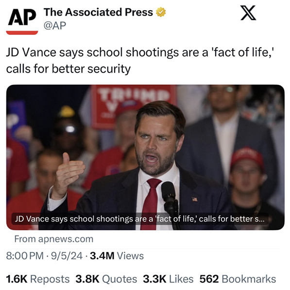 AP put out an X post that partially quoted Vance where the Republican vice presidential nominee lamented that school shootings have become a “fact of life” following a shooting at a Georgia high school where four people were killed.