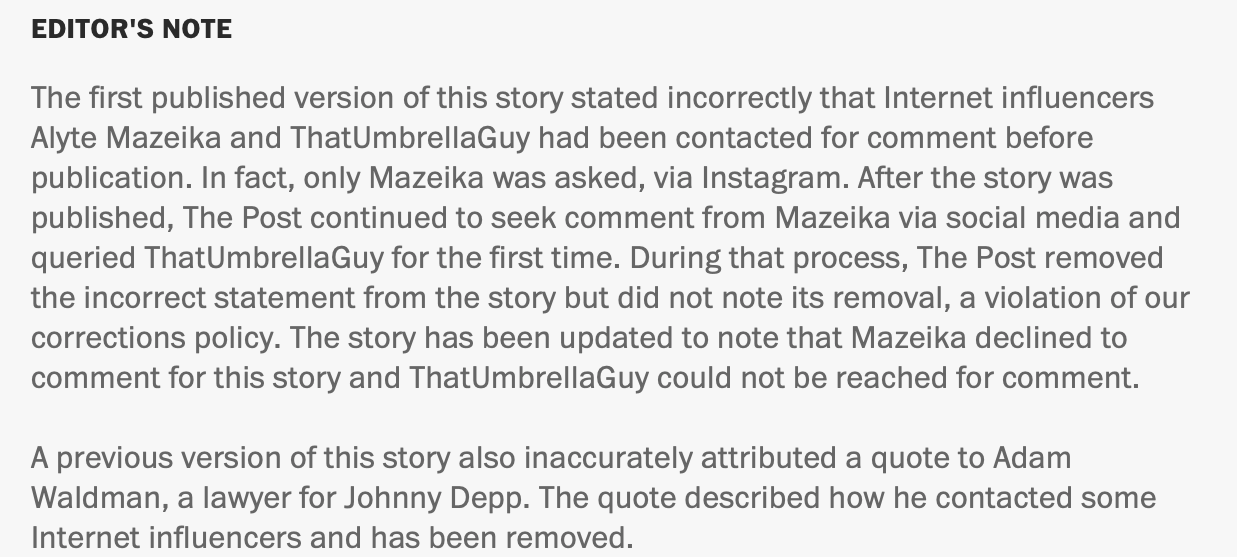 Wemple added Lorenz’s admission that she did not reach out to the people in her story until after publication is “in conflict with the editor’s note,” which it is.