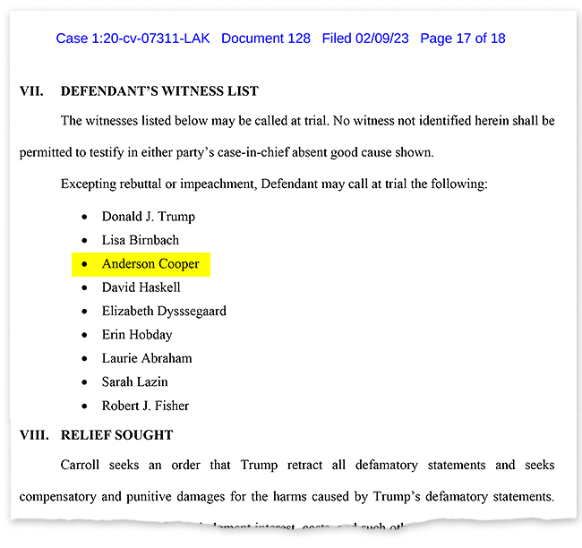 The witness lists in the lawsuit brought against ex-president Donald Trump by E. Jean Carroll includes among the names CNN’s Anderson Cooper as a witness for the defense.