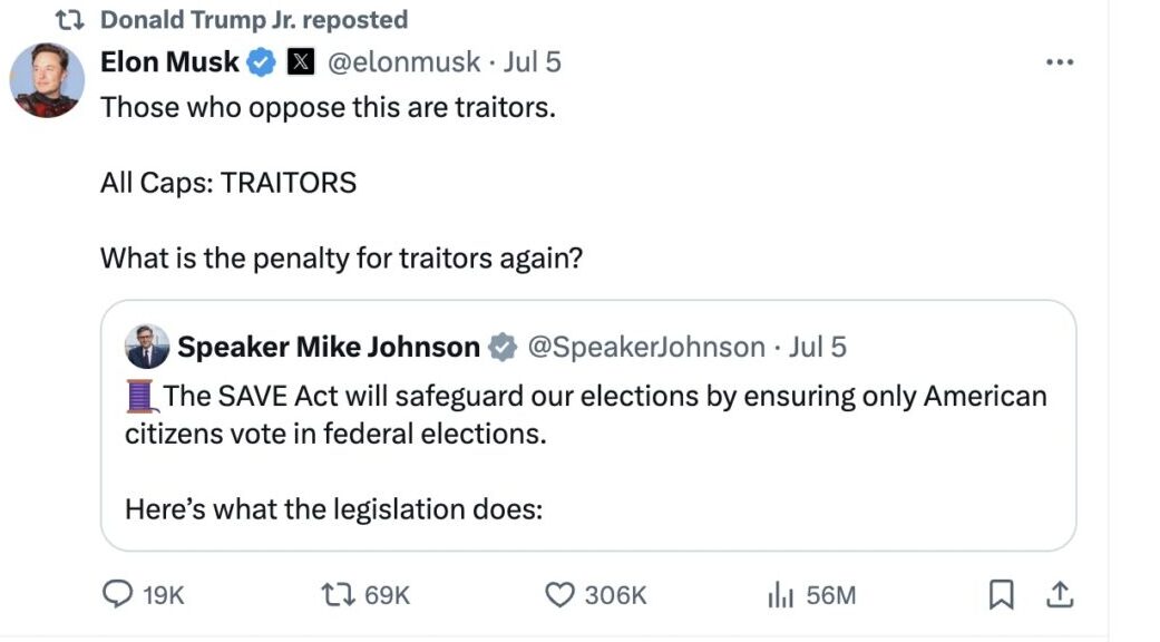 Trump Jr. also recently re-posted a call from Elon Musk to execute anyone who so much as opposed a new bill aimed at stopping non-citizens from voting in U.S. elections.