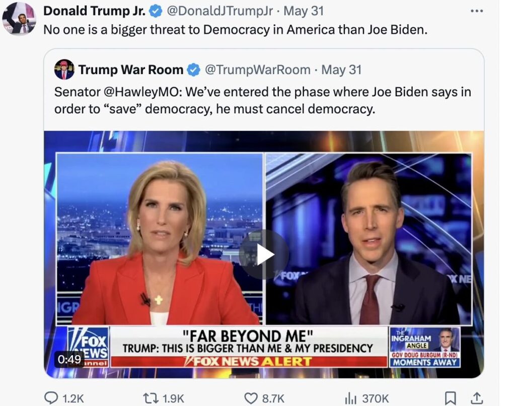 Trump Jr. himself has referred to Biden as a “threat to Democracy.” In a May 31 post to X/Twitter, Trump Jr. said: “No one is a bigger threat to Democracy in America than Joe Biden.”
